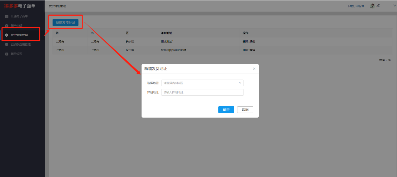 · 已用來開通電子面單的地址不允許編輯和刪除;