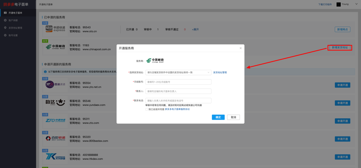 加盟型快遞公司在申請開通時,需要選擇發貨地址、開通網點,填寫聯系人、聯系電話,點擊“確定”后,等待快遞公司審批即可;