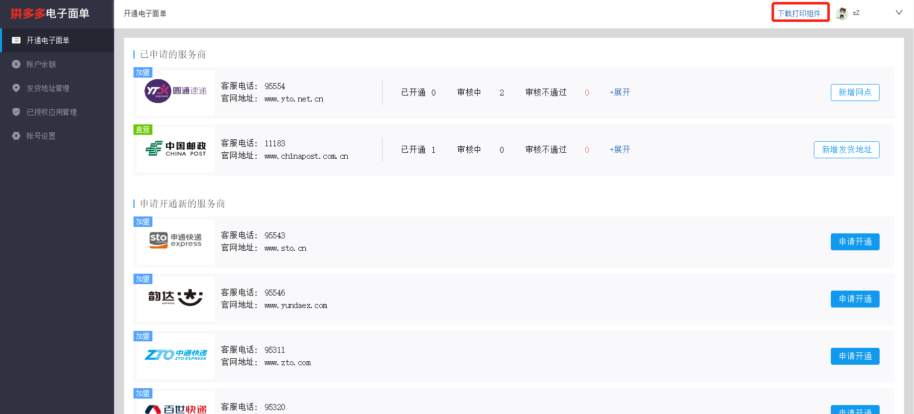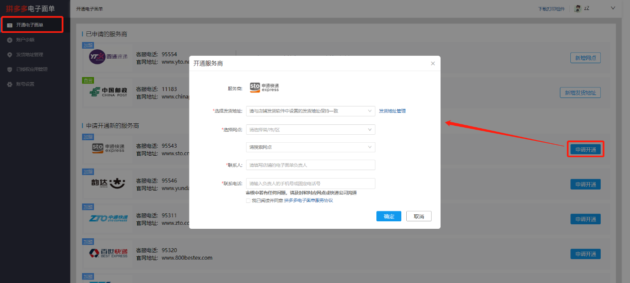 點擊【開通電子面單】頁面,選擇您想要開通的快遞公司,點擊【申請開通】,服務商分為直營型和加盟型兩種;