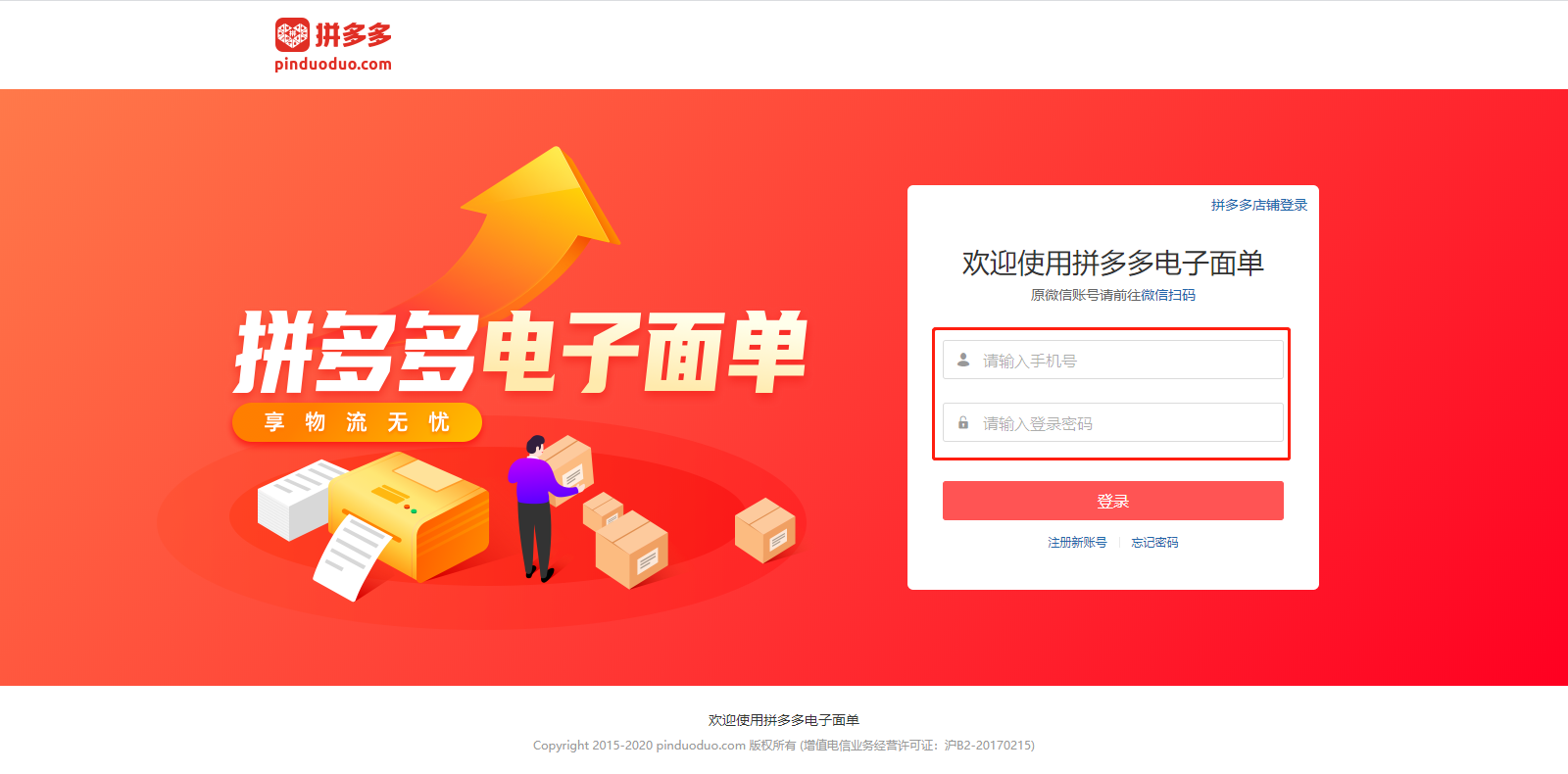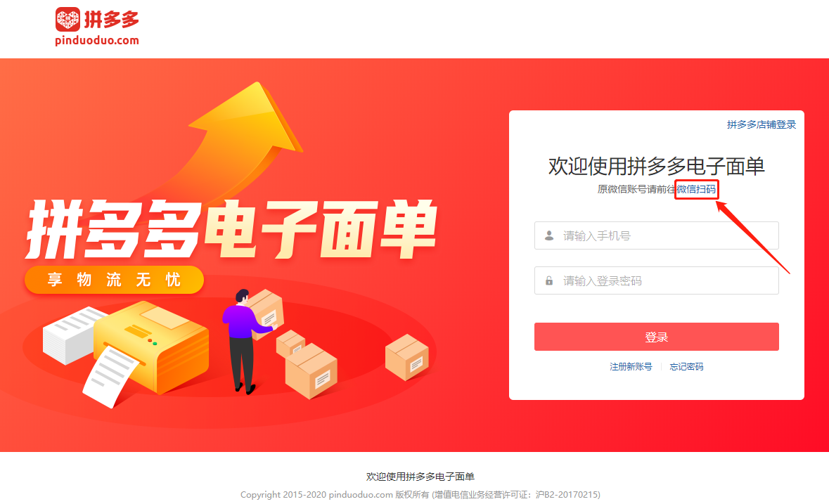 拼多多電子面單平臺目前支持兩種登錄方式:手機號密碼登錄、拼多多店鋪登錄。如果您是之前使用微信登錄的老用戶,需進行微信掃碼綁定與注冊,后續切換到手機號密碼登錄來使用哦。